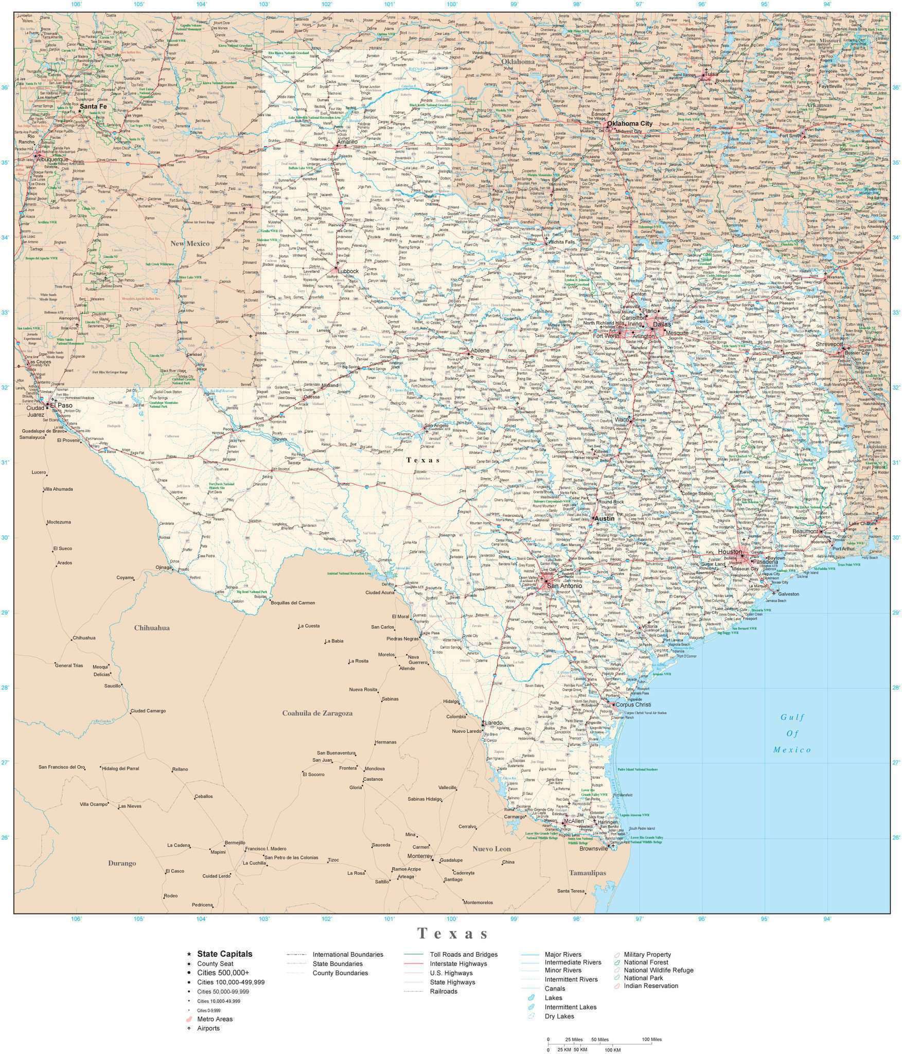 Texas Detailed Map in Adobe Illustrator vector format. Detailed